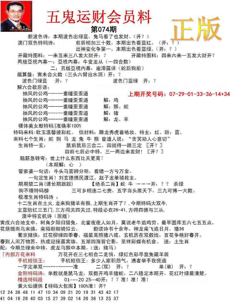 2026074正版五鬼运财会员料