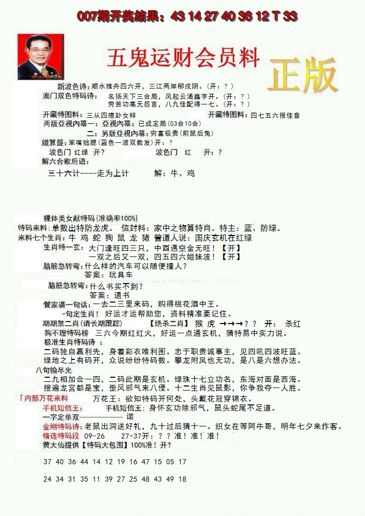 2026008正版五鬼运财会员料