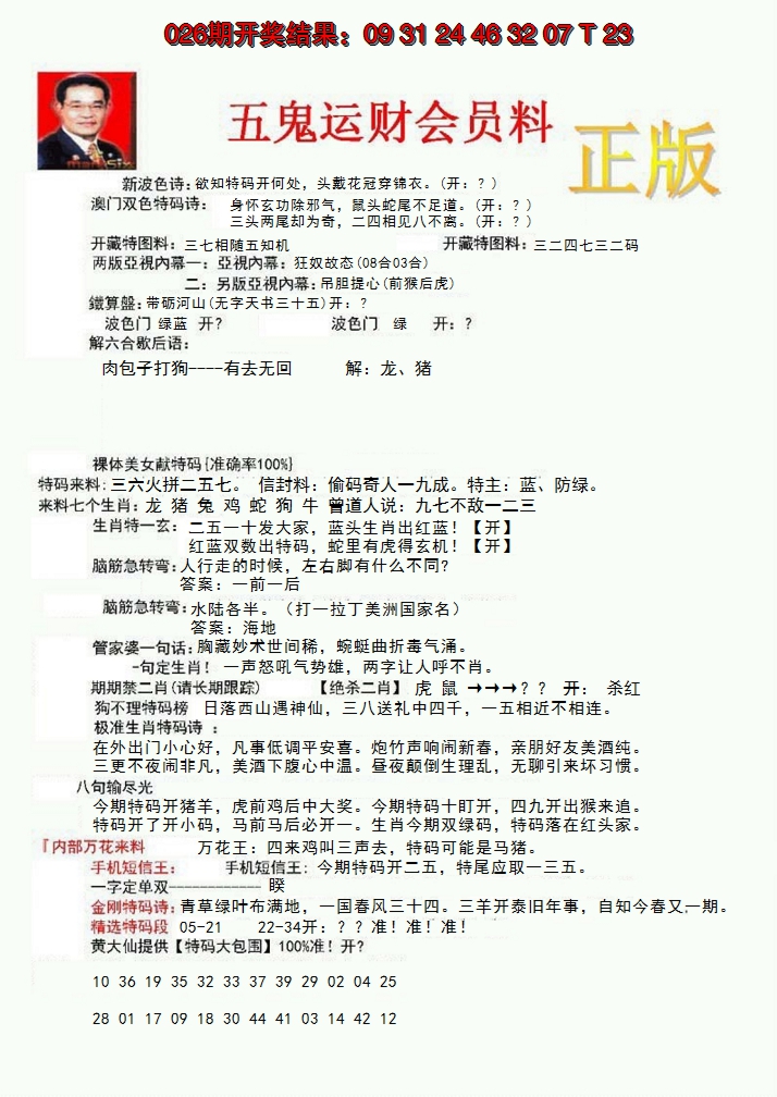 2026027正版五鬼运财会员料
