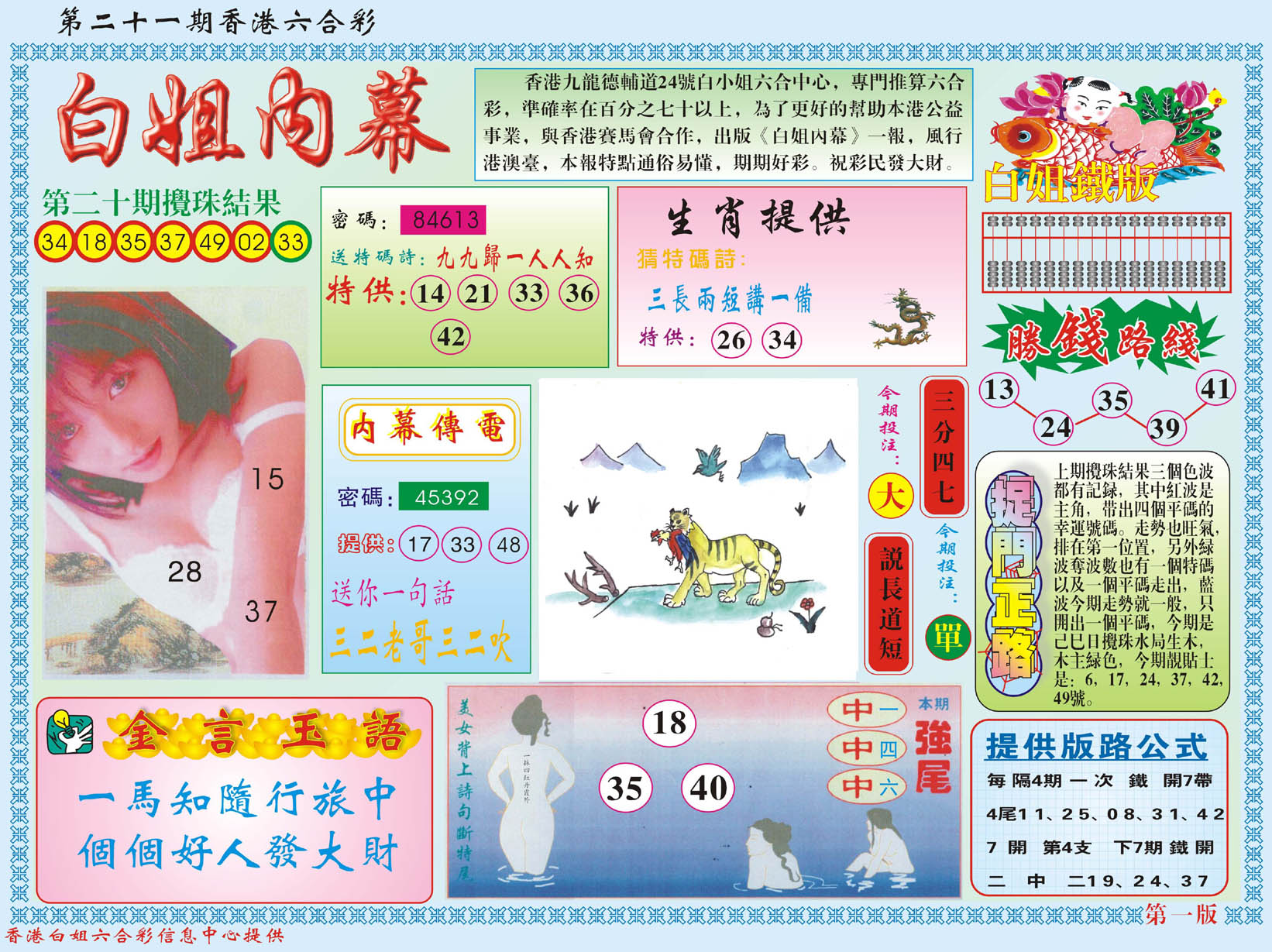 标签: 说明:提供最快、最新、最全的彩色正版全年图纸新闻资讯,同时还提供六合港彩开奖时时在线直播、平特码数据生肖大小单双等走势分析、六合港彩及彩票开奖新闻资讯以及专家心水推荐等。
